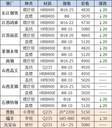 23日12:00起江陰西城刨花下調(diào)30-40,其他不變,調(diào)后:精爐料4000重廢3890中廢3830普通爐料3770鋼筋頭4000沖子3890-3940冷熱軋料3790-3890爐料壓塊3600鐵皮壓塊3300鋼刨花3660數(shù)控刨花3570普通刨花3480刨花壓塊3420刨花長絲3360含稅單位:元/噸。