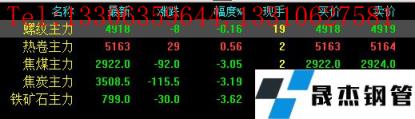 今日螺紋主力期貨跌8,收?qǐng)?bào)4918,跌幅0.16%;熱卷主力漲29,收?qǐng)?bào)5163,漲幅0.56%;焦煤主力跌92,收?qǐng)?bào)2922,跌3.05%;焦炭主力跌115.5,收?qǐng)?bào)3508.5,跌幅3.19%;鐵礦石主力跌30,收?qǐng)?bào)799,跌幅3.62%。
